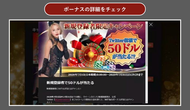 現在は「新規登録者で50ドルが当たる」というイベント(開催期間2020年7月1日~7月31日)があります。開催期間中にクイーンカジノに新規登録し、公式Twitterアカウントをフォローして初回入金をするだけで50ドルのボーナスが当たるイベントです。ノーリスクで50ドルもらえるイベントは他を探してもなかなかありません。