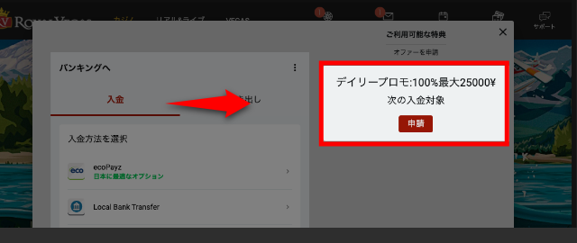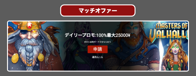 約束されているマッチオファーは、毎日獲得できるデイリーボーナスです。獲得したオファー内容は、画面上部メニューの『プロモーション』から確認できます。(ログイン時にも表示されます。)