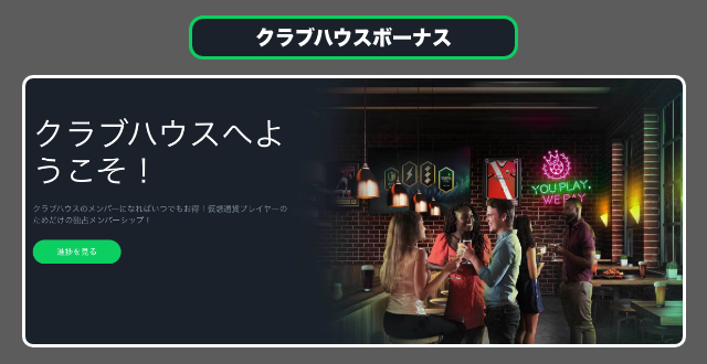 ほとんどのボーナスはロイヤリティプログラム「クラブハウス」に集約されており、遊んだ額に応じてフリースピンやキャッシュボーナスが進呈されます。