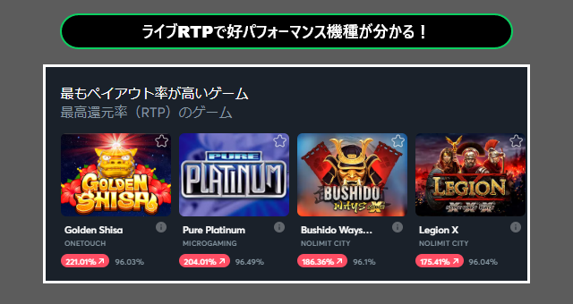 スポーツベットアイオーでカジノゲーム選びに困ったら、「ライブRTP」を活用してみてください。ライブRTPでは、リアルタイムで対象機種の期間別ペイアウト率を確認できます。