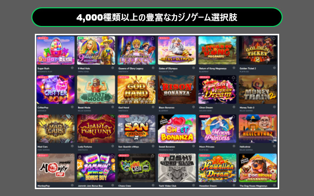 スポーツベットアイオーは4,000種類以上のカジノゲームがあります。採用ソフトウェアは60社を超え、ライブカジノは9種類もあるため、ゲームの豊富さは業界トップクラス!オンラインカジノとしてもブックメーカーとしても優秀です。