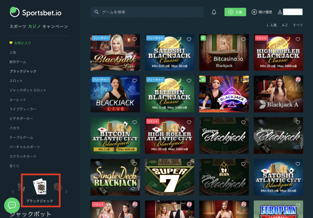 テーブルゲームでブラックジャックを遊ぶ場合はSportsbet.ioの左下部分にあるある「ブラックジャック」のマークをクリックしてください。