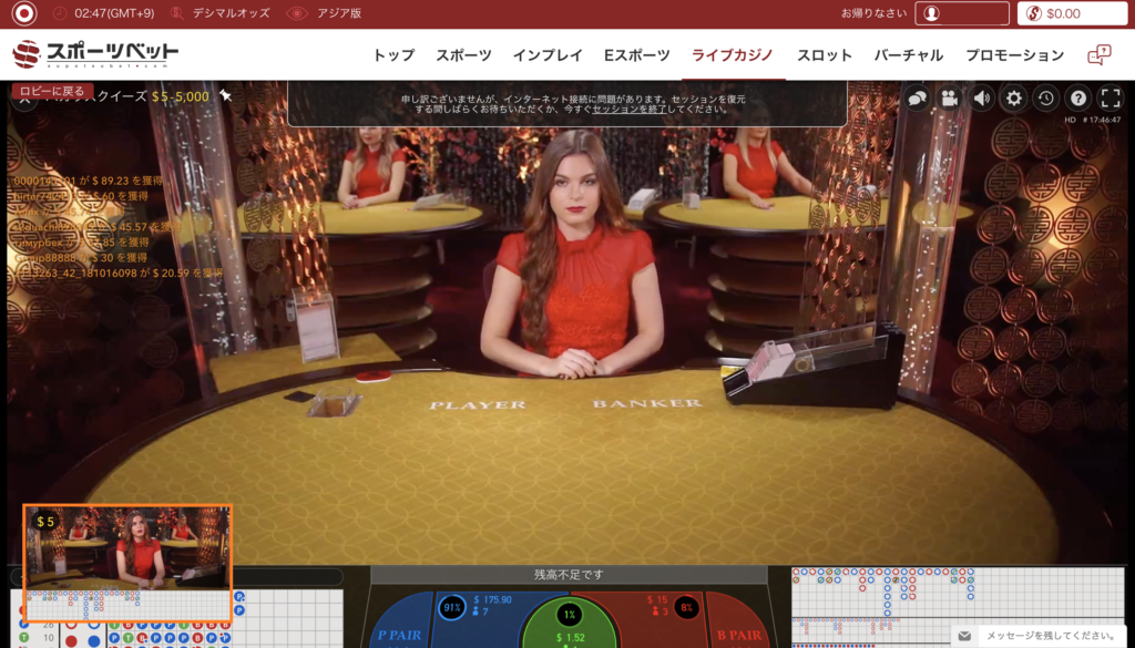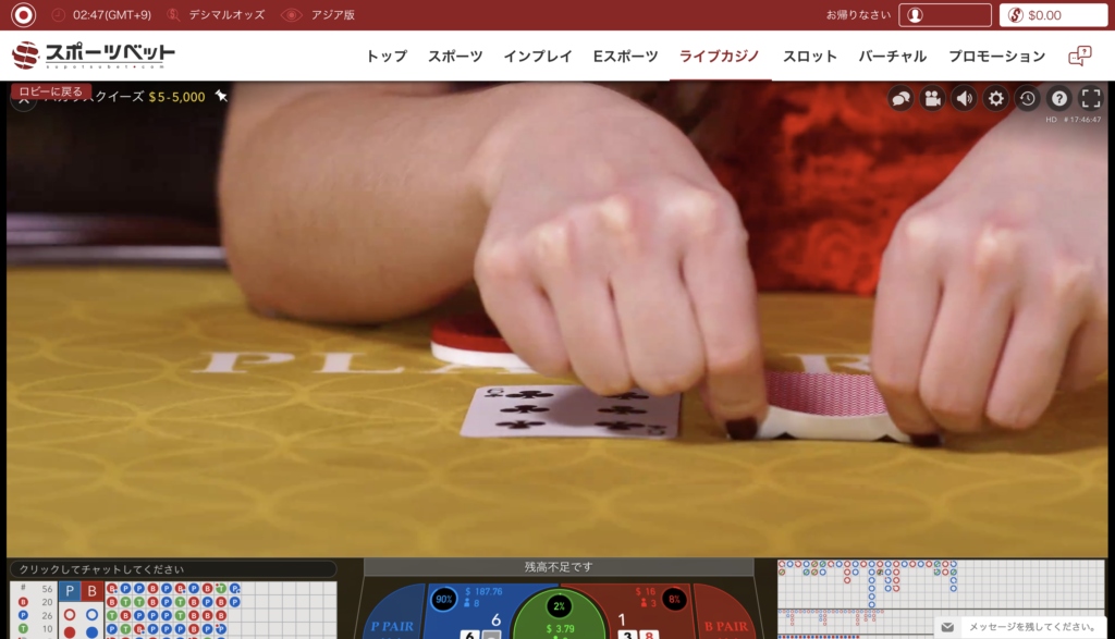 スポーツベットが特化しているのはスポーツブックだけではありません。カジノの王様バカラも楽しむことができます。しかも、臨場感たっぷりのバカラスクイーズを美女ディーラーと楽しむことができるのがおすすめのポイントです。