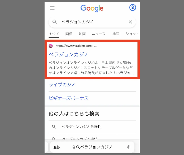 Safariを開いたら、『ベラジョンカジノ』や『Verajohn Casino』で検索し、URLに『https://www.verajohn.com』と書かれているサイトタイトルをタップしましょう。