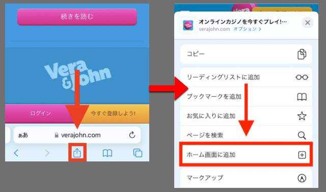 ベラジョンカジノの公式サイトが表示されたら、画面最下部にある共有アイコンをタップし、『ホーム画面に追加』をタップしてください。