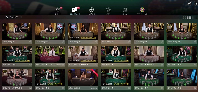 - ライブカジノとテーブルゲームで20種類以上のブラックジャックが楽しめる。