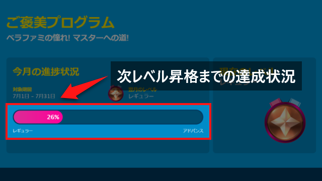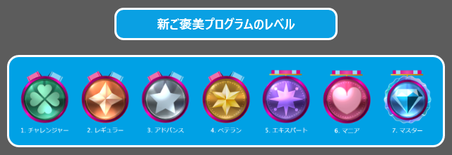 コインが発行されるご褒美プログラムのレベルは全部で7段階あります。