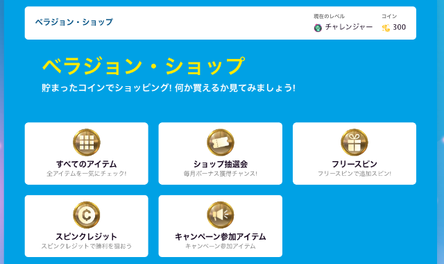 貯まったコインを使えるのはベラジョン・ショップのみ。フリースピンやキャッシュが当たる抽選券やキャンペーン参加に必要なアイテムと交換できます。