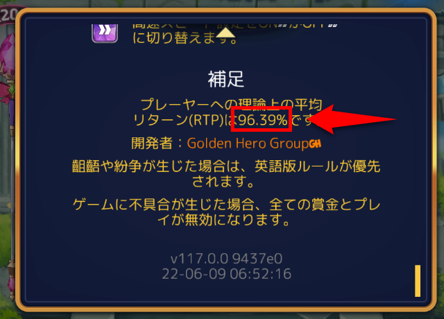 各カジノゲームの還元率は「i」や「?」マークからチェックできるゲーム詳細ページで確認できます。RTP=還元率なので、RTPの文字を探せばその機種の還元率が分かります。