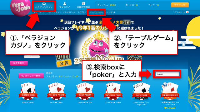 ベラジョンカジノのテーブルゲームは、上記の画像のように「テーブルゲーム」をクリックし、検索で「Poker」もしくは「Hold’em」と検索してください。