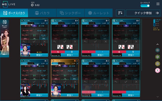ルーレットのテーブルは1つしかありませんが、バカラのテーブルは多いので、ルーレットとバカラのテーブルを複数監視してベット機会をうかがうプレイスタイルのプレイあーにはうってつけです。