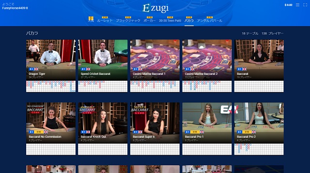 Ezugiはヨーロッパ系ソフトウェアの1つです。先に紹介したエレガントなEvolutionGamingとは異なり、カジュアルなスタイルなので、堅苦しくない雰囲気のなかでゲームを楽しめます。