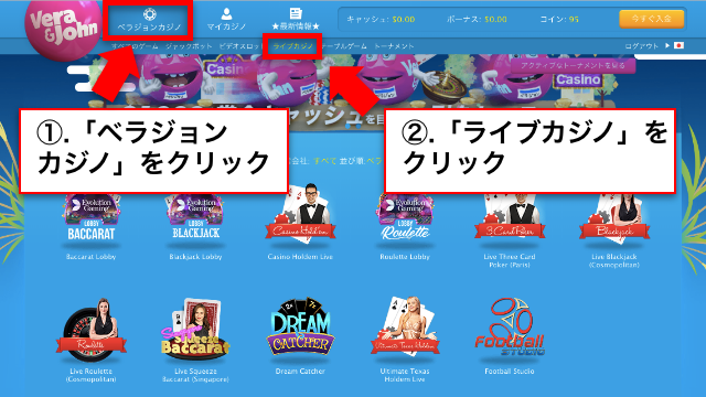 公式HPの上部にあるメニュー欄の『ライブカジノ』をクリックすると、ライブカジノで遊ぶことができます。