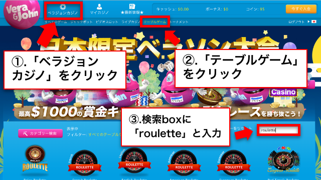ベラジョンカジノのテーブルゲームは、上記の画像のように「テーブルゲーム」をクリックし、検索で「Roulette」と検索してください。