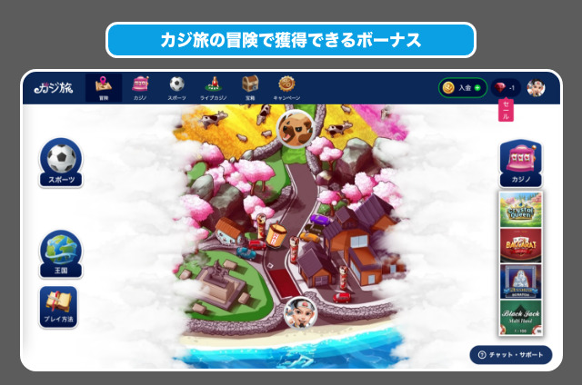 カジ旅といえばやはりRPG風に仕立て上げられたボーナス制度が最大の魅力です。この点に少しでも興味を持つなら一度はカジ旅で遊んでみたほうがいいでしょう。