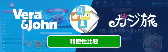 ベラジョンカジノとカジ旅はどちらもエンタメ性が高いサイトデザインで比較されやすいオンラインカジノです。