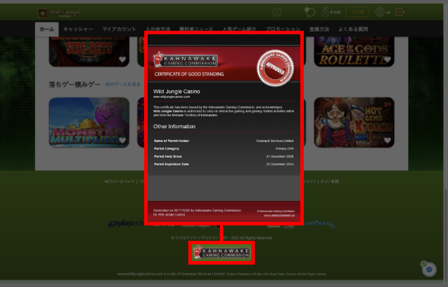 ワイルドジャングルカジノはカナダにあるライセンス発行団体である「カナワケ・ゲーミング・コミッション」から公認を受けているオンラインカジノです。