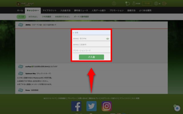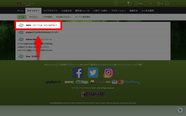 ワイルドジャングルカジノに入金する手順