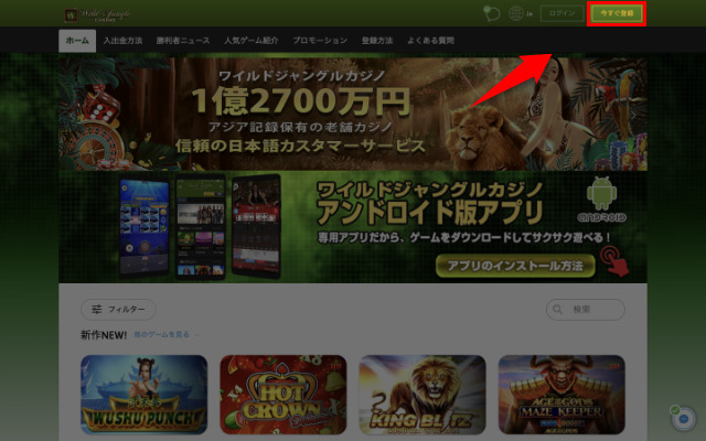 まず初めに、ワイルドジャングルカジノの公式サイトにアクセスしてください。