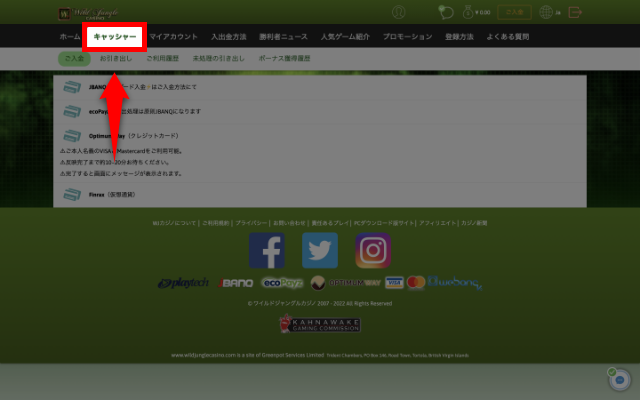まずワイルドジャングルカジノにログインし、ホーム画面から「キャッシャー」をクリックしてください。