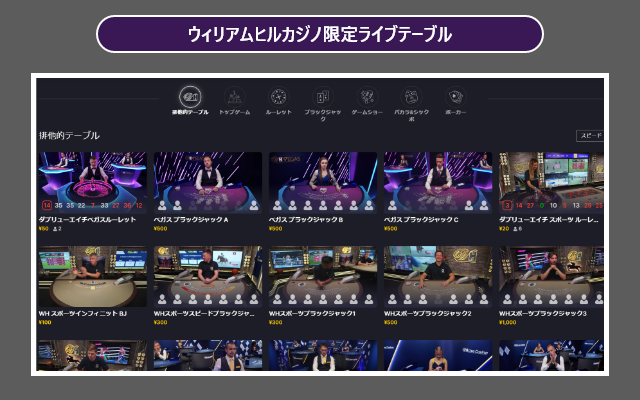 しかし、少ないながらも選択肢はハイレベル!ウィリアムヒルカジノ限定の超高配当スロットがありますし、ライブカジノ最大手Evolution Gamingにはウィリアムヒルカジノ専用テーブルが多数用意されています。