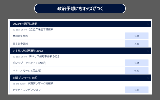 オッズを見ながら政治の行く末を見守るなんて、少し洒落た大人な楽しみ方といえますね。政治・スポーツ以外では、ノーベル賞やグラミー賞の予想にもベットできます。