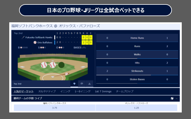 また、ウィリアムヒルカジノは英国企業ですが、ヨーロッパ開催の試合だけでなく、日本の「パリーグ、(セリーグ」や「Jリーグ」にもベット可能です。