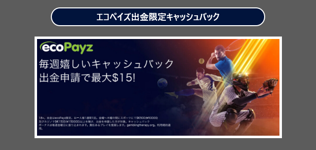 | ボーナス | ・最大$100初回限定100%ボーナス(スポーツベット) ・最大$300ウェルカムボーナス(カジノ) ・エコペイズ限定出金キャッシュバック |