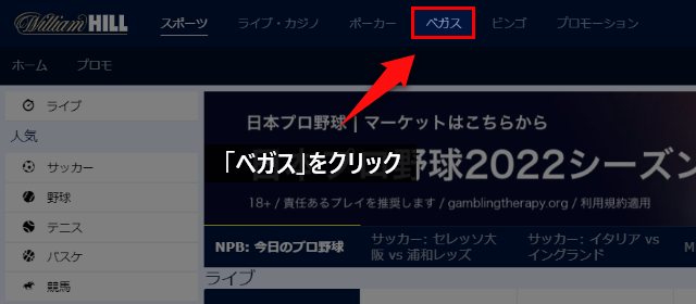 登録してログイン後、画面上部にあるメニュー「ベガス」をクリックしてください。