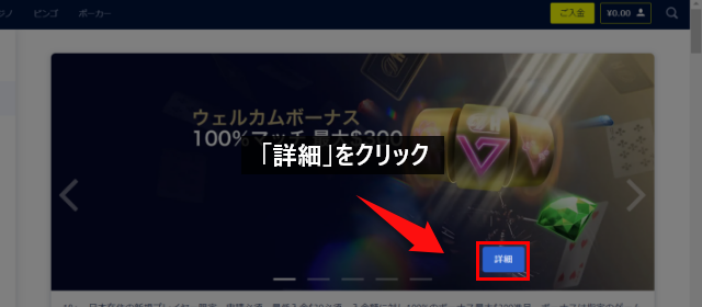 「ベガス」ページに切り替えたら、プロモーションメニューでウェルカムボーナスの「詳細」をクリック。