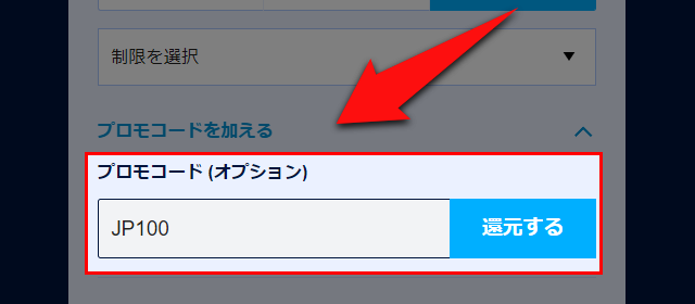 新規登録手続き画面の最後に「プロモーションコードを加える」という項目があります。こちらをクリックして「JP100」と入力してください。