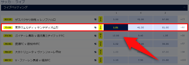 メニュー「ライブ」⇒「サッカー」の順にクリックすれば、サッカーのライブベット一覧が表示されます。