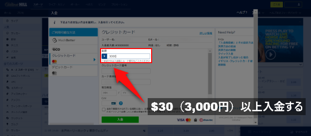 申請後は7日以内に初回入金を完了させてください。ボーナス獲得に必要な最低入金額は$30(3,000円)です。