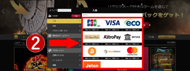 登録手続きが完了したら、ウィニングキングスで遊ぶ資金を入金しましょう。