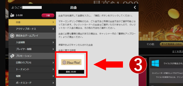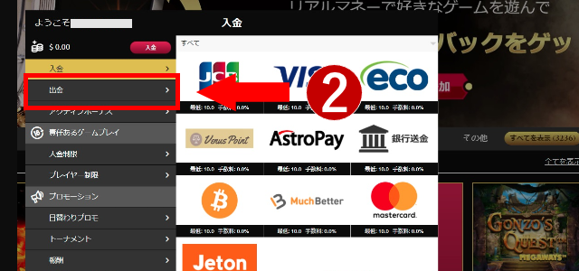 カジノゲームで勝って獲得した勝利金は、以下の手順にしたがえば出金できます。