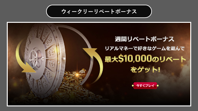 | ウィークリーリベートボーナス | 1週間のベット額の一部を最大1.0%の還元率で最高10,000を翌週月曜日に還元 |