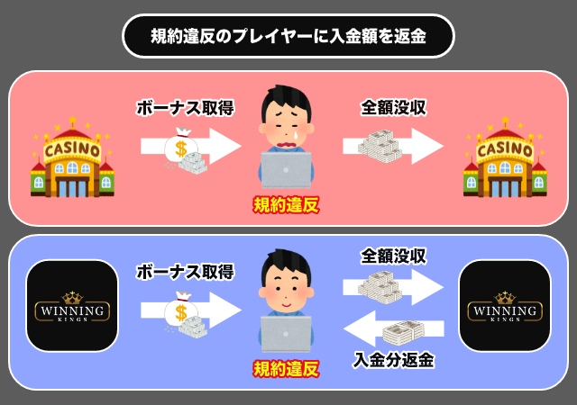 ウィニングキングスはボーナスの規約違反をしたプレイヤーに入金額を返金しました。