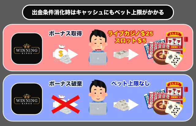 ウィニングキングスはボーナス豊富なオンラインカジノではありますが、ボーナスの出金条件は業界のなかでもかなり厳しい方です。