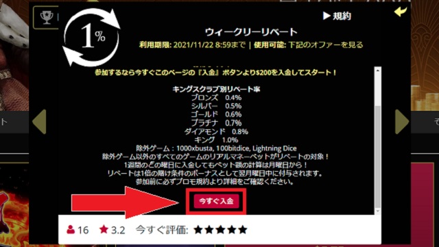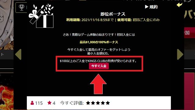 初回入金即位ボーナスを貰うついでに、VIPプログラム「KINGS CLUB」に入会したい方は、初回入金で$100以上入金してください。