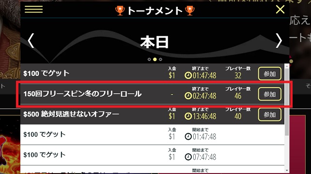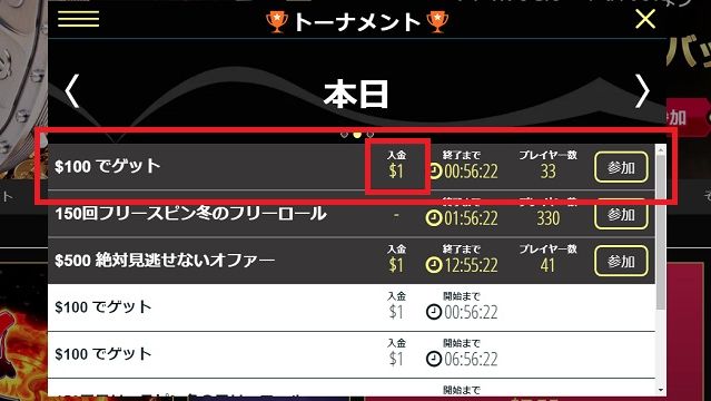 バイイントーナメントに参加したい場合は、参加費が記載されているトーナメントの「参加」ボタンをクリックしてください。