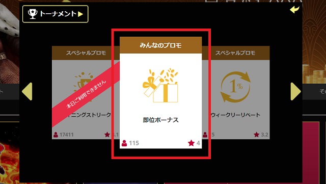 初回入金即位ボーナスを獲得したい場合は、メニューの日替わりプロモで「即位ボーナス」を選択しましょう。
