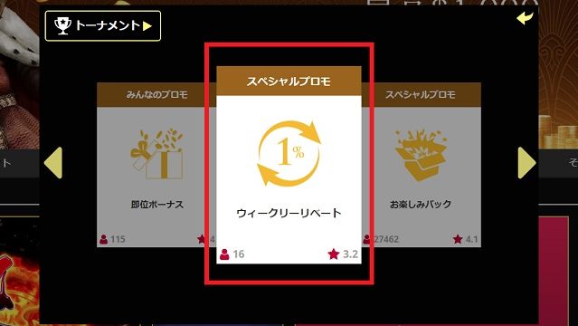 ウィークリーリベートボーナスを獲得したい場合は、まず日替わりプロモで「ウィークリーリベート」を選択してください。