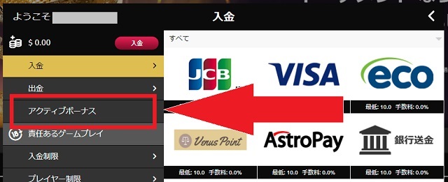 ウィニングキングスの出金条件消化状況は「キャッシャー」メニュー内にある「アクティブボーナス」ページで確認できます。