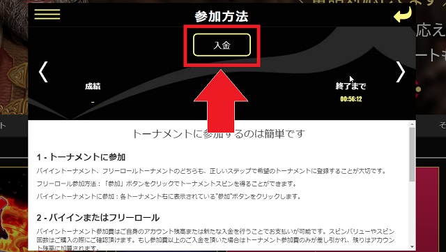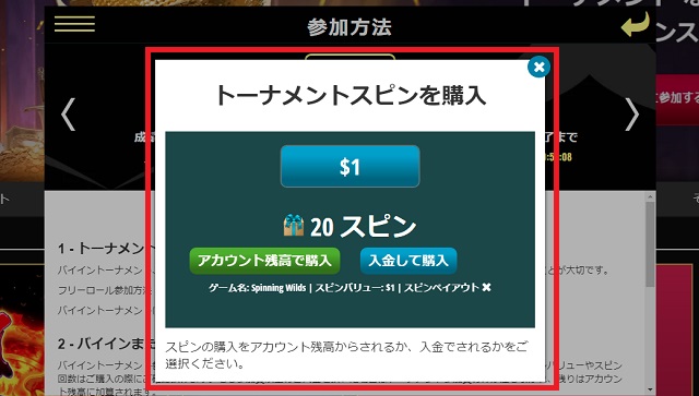 「入金」をクリックすると、トーナメントスピンの購入方法が表示されます。「アカウント残高で購入」または「入金して購入」をクリックし、決済を済ませればトーナメント参加手続きは完了です。