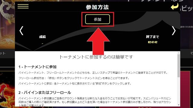 続いて、次画面で「参加」をクリックすれば、フリーロールトーナメントへの参加手続きは完了です。
