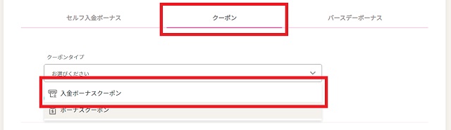 次に、メニュー「ボーナス受取」⇒「クーポン」で、「入金ボーナスクーポン」を選択しましょう。