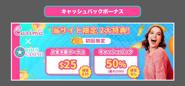 当サイトからユースカジノへ登録していただいた方限定で$25の入金不要ボーナスを贈呈しています。(キャッシュバックボーナスに関しては後述)ユースカジノで獲得できる通常の入金不要ボーナスは$10なのでかなりお得です。