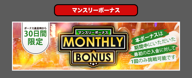 「マンスリーボーナス」は開催期間中に入金すると貰える入金ボーナスです。