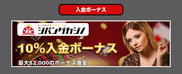 ジパングカジノには最大$2,000ゲットできる10%入金ボーナス(マッチボーナス)もあります。