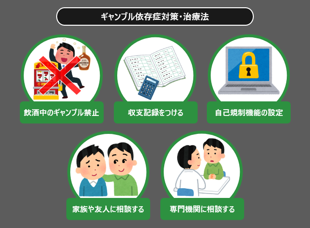 ギャンブル依存症にならないための対策方法と、なった場合の治療方法について下記5つをご紹介していきます。